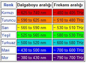 Yukarıdaki tabloda görüldüğü gibi en yüksek dalga boyuna sahıp ve dokunun en derinine etki eden lazer ışını kırmızı olanıdır. En yüksek frekans aralığı ve en yüksek dalga boyuna sahiptir. Etki alanı dalgaboyu aralıkları düştükçe düşmektedir ki bunu da tablodan görebilirsiniz.